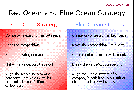 “红海”是竞争极端激烈的市场,但“蓝海”也不是一个没有竞争的领域,而是一个通过差异化手段得到的崭新的市场领域,在这里,企业凭借其创新能力获得更快的增长和更高的利润。