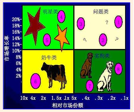 市场营销组合(marketing mix)市场营销组合(Marketing Mix)是系统工程理论在企业营销活动中的具体运用,是指企业根据目标市场的需要,在一定范围内对可以发挥主观能动性,基本可以控制的各种市场手段的综合运用。 (2)明星型业务(stars,指高增长、高市场份额) 这个领域中的产品处于快速增长的市场中并且占有支配地位的市场份额,但也许会或也许不会产生正现金流量,这取决于新工厂、设备和产品开发对投资的需要量。明星型业务是由问题型业务继续投资发展起来的,可以视为高速成长市场中的领导者,它将成为公司未来的现金牛业务。但这并不意味着明星业务一定可以给企业带来源源不断的现金流,因为市场还在高速成长,企业必须继续投资,以保持与市场同步增长,并击退竞争对手。企业如果没有明星业务,就失去了希望,但群星闪烁也可能会闪花企业高层管理者的眼睛,导致做出错误的决策。这时必须具备识别行星和恒星的能力,将企业有限的资源投入在能够发展成为现金牛的恒星上。同样的,明星型业务要发展成为现金牛业务适合于采用增长战略。 (3)现金牛业务(Cash cows,指低增长、高市场份额) 处在这个领域中的产品产生大量的现金,但未来的增长前景是有限的。这是成熟市场中的领导者,它是企业现金的来源。由于市场已经成熟,企业不必大量投资来扩展市场规模,同时作为市场中的领导者,该业务享有规模经济和高边际利润的优势,因而给企业带来大量现金流。企业往往用现金牛业务来支付帐款并支持其他三种需大量现金的业务。现金牛业务适合采用战略框架中提到的稳定战略,目的是保持SBUs的市场份额。 (4)瘦狗型业务(Dogs,指低增长、低市场份额) 这个剩下的领域中的产品既不能产生大量的现金,也不需要投入大量现金,这些产品没有希望改进其绩效。一般情况下,这类业务常常是微利甚至是亏损的,瘦狗型业务存在的原因更多的是由于感情上的因素,虽然一直微利经营,但象人养了多年的狗一样恋恋不舍而不忍放弃。其实,瘦狗型业务通常要占用很多资源,如资金、管理部门的时间等,多数时候是得不偿失的。瘦狗型业务适合采用战略框架中提到的收缩战略,目的在于出售或清算业务,以便把资源转移到更有利的领域。 Why BCG Matrix?BCG矩阵的精髓在于把战略规划和资本预算紧密结合了起来,把一个复杂的企业行为用两个重要的衡量指标来分为四种类型,用四个相对简单的分析来应对复杂的战略问题。该矩阵帮助多种经营的公司确定哪些产品宜于投资,宜于操纵哪些产品以获取利润,宜于从业务组合中剔除哪些产品,从而使业务组合达到最佳经营成效。 模型的重要假设早在还没有提出BCG矩阵之前的1966年,波士顿咨询公司通过实证研究获得了一个重要发现——经验曲线。经验曲线的基本结论是: “经验曲线是由学习、分工、投资和规模的综合效应构成的。”“每当积累的经验翻一番,增值成本就会下降大约20%到30%。” “经验曲线本质上是一种现金流量模式。”因为规模是学习与分工的函数,所以可以用规模来代表经验曲线中的学习和分工成份。 企业某项业务的市场份额越高,体现在这项业务上的经验曲线效应也就越高,企业就越有成本优势,相应的获利能力就越强。按照波士顿公司的经验,如果一个企业某项业务的市场份额是竞争者该项业务市场份额的两倍,那么这个企业在这项业务上就具有较之竞争者20-30%的成本优势。这就是BCG选取市场份额作为一个重要评价指标的原因所在。 BCG认为市场份额能导致利润,这其实就是“成本领先战略 ”。BCG一直认为规模优势很重要,BCG自己的解释是市场份额大的公司不仅获得了更多的收入,还实现了更高的单位运营利润,优势在于更高的价格(边际利润)、在广告和分销上更低的单位支出。 如何用模型来分析(1)评价各项业务的前景。BCG是用“市场增长率”这一指标来表示发展前景的。这一步的数据可以从企业的经营分析系统中提取。 (2)评价各项业务的竞争地位。BCG是用“相对市场份额”这个指标来表示竞争力的。这一步需要做市场调查才能得到相对准确的数据。计算公式是把一单位的收益除以其最大竞争对手的收益。 (3)表明各项业务在BCG矩阵图上的位置。具体方法是以业务在二维坐标上的坐标点为圆心画一个圆圈,圆圈的大小来表示企业每项业务的销售额。 到了这一步公司就可以诊断自己的业务组合是否健康了。一个失衡的业务组合就是有太多的狗类或问题类业务,或太少的明星类和金牛类业务。例如有三项的问题业务,不可能全部投资发展,只能选择其中的一项或两项,集中投资发展;只有一个现金牛业务,说明财务状况是很脆弱的,有两项瘦狗业务,这是沉重的负担。 (4)确定纵坐标“市场增长率”的一个标准线,从而将“市场增长率”划分为高、低两个区域。 比较科学的方法有两种: A. 把该行业市场的平均增长率作为界分点 B. 把多种产品的市场增长率(加权)平均值作为界分点 需要说明的是,高市场增长定义为销售额至少达到10%的年增长率(扣除通货膨胀因素後)。 (5)确定横坐标“相对市场份额”的一个标准线,从而将“相对市场份额”划分为高、低两个区域。 BCG的布鲁斯认为,这个界分值应当取为2,他认为“任何两个竞争者之间,2比1的市场份额似乎是一个均衡点。在这个均衡点上,无论哪个竞争者