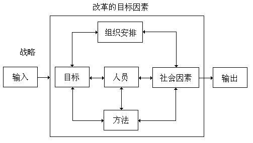 ①输入主要输入内部信息和外部信息。内部信息主要包括组织的长处和短处,外部信息主要包括外部的机会与威胁。输入应该与组织的战略相一致。 ②改革的目标因素改革的目标因素有五个:人员、目标、组织安排、社会因素和方法。五个因素以人员为核心,相互影响。人员主要是指人的知识、能力、态度、动机和行为。目标主要包括:要达到最终结果、优先考虑的事项、标准、资源、贯穿整个组织的联系。组织安排主要包括:政策、程序、角色、结构、奖励和物资条件。社会因素主要包括:组织文化、群体过程、人际关系、沟通和领导。方法主要包括:工序、工作流程、工作设计和技术。 ③输出输出代表了一次变革的最终结果。