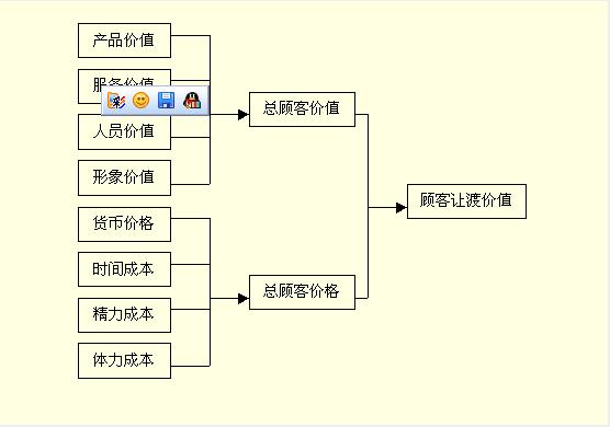 顾客让渡价值(Customer Delivered Value)顾客让渡价值(CUSTOMER DELIVERED VALUE)是费力普·科特勒在1994年提出的。他认为顾客将从那些他们认为提供最高顾客让渡价值的公司购买商品或服务。 顾客让渡价值是指在顾客获得的总价值与顾客为之付出的总成本之间的差距。顾客满意度是由其所获得的让渡价值大小决定的。 顾客总价值(TOTAL CUSTOMER VALUE)是指顾客购买某一特定产品或服务所获得的全部利益,它包括产品价值、服务价值、人员价值和形象价值等。 顾客总成本(TOTAL CUSTOMER COST)是指顾客为购买某一特定产品或服务所耗费的时间、精神、体力以及所支付的货币资金等,它包括货币成本、时间成本、精神成本和体力成本等。 由于顾客在购买产品或服务时,总希望把货币、时间、精神和体力等有关的成本降到最低限度,而同时又希望从中获得更多的实际利益,以使自己的需要得到最大限度的满足。因此,顾客在选购产品或服务时,往往从价值与成本两个方面进行比较分析,从中选出价值最高、成本最低,即“顾客让渡价值”最大的产品或服务作为优先选购的对象。顾客所获得让渡价值越大,其满意度就越高。 企业为了在竞争中战胜对手,吸引更多的潜在顾客,就必须向顾客提供比竞争对手具有更多“顾客让渡价值”的产品或服务。这样,才能使自己的产品或服务为顾客所注意,从而购买本企业的产品或服务。为此,企业可以从两个方面改进自己的工作:一是通过改进产品、服务、人员与形象,提供产品的总价值;二是通过降低生产与销售成本,减少顾客购买产品的时间、精神与体力的耗费,从而降低货币和非货币成本。 1.顾客获得的总价值 使顾客获得更大“顾客让渡价值”的途径之一,是增加顾客购买的总价值。顾客总价值由产品价值、服务价值、人员价值和形象价值构成,其中每一项价值因素的变化均对总价值产生影响。 a产品价值 产品价值是由产品的功能、特性、品质、品种与式样等所产生的价值。它是顾客需要的中心内容,也是顾客选购商品的首要因素,因而一般情况下,它是决定顾客购买总价值大小的关键和主要因素。产品价值是由顾客需要来决定的,在分析产品价值时应注意两点: ▲在经济发展的不同阶段,顾客对产品的需要有不同的要求,构成产品价值的要素以及各种要素的相对重要程度也会有所不同。例如,在我国计划经济体制阶段,由于产品长期短缺,因而顾客购买产品时更看中产品的耐用性、可靠性等性能方面的质量,而对产品的花色、式样、特色等却考虑很少。而在物质生活丰富的今天,顾客往往更重视产品的特色质量。 ▲在经济发展的同一事情,不同类型的顾客对产品价值也会有不同的要求,在购买行为上显示出极强的个性特点和明显的需求差异性。因此,这就要求企业必须认真分析不同经济发展时期顾客需求的共同特点以及同一发展时期不同类型顾客需求的个性特征,并据此进行产品的开发与设计,从而为顾客创造更大的价值。 b服务价值 服务价值是指伴随产品实体的出售,企业向顾客提供的各种附加服务,包括产品介绍、送货、安装、调试、维修、技术培训、产品保证等所产生的价值。服务价值是构成顾客总价值的重要因素之一。在现代的消费市场上,消费者在选购产品时,不仅注意产品本身的价值的高低,而且更注意产品附加价值的大小。特别是在同类产品质量与性质大体相同或类似的情况下,企业向顾客提供的附加服务越完备,产品的附加价值越大,顾客从中获得的实际利益就越大,从而购买的总价值就越大;反之,则越小。因此,在提供优质产品的同时,向消费者提供完善的服务,已成为现代企业市场竞争的新焦点。 c人员价值 人员价值是指企业员工的经营思想、知识水平、业务能力、工作效益和质量、经营作风、应变能力所产生的价值。企业员工直接决定着企业为顾客提供的产品与服务的质量,决定着顾客购买总价值的大小。一个综合素质较高又具有顾客导向经营思想的工作人员,会比知识水平低、业务能力差、经营思想不端正的工作人员为顾客创造更高的价值,从而创造更多的满意的顾客,进而为企业创造市场。人员价值对企业、对顾客的影响作用是巨大的,并且这种作用是潜移默化的。因此,高度重视对企业人员综合素质和能力培养,加强对员工日常工作的极力、监督和管理,使其始终保持较高达到工作质量与水平就显得非常重要。 d形象价值 形象价值是指企业及其产品在社会公众中形成的总体形象所产生的价值。包括企业的产品、技术、包装、商标、工作场所等所构成的有形形象所产生的价值,公司及其员工的职业道德行为、经营行为、服务态度、作风等行为形象所产生的价值,以及企业的价值观念、管理哲学等理念形象所产生的价值等。形象价值与产品价值、服务价值、人员价值密切相关,在很大程度上是上述三个方面价值综合作用的反映和结果。形象对企业来说是宝贵的无形资产,良好的形象会对企业的产品产生巨大的支持作用,赋予产品较高的价值,使顾客的需要得到更高层次和更大限度的满足,从而增加顾客购买的总价值。因此,企业应高度重视自身形象塑造,为企业进而为顾客带来更大的价值。 2.顾客购买的总成本 使顾客获得更大“顾客让渡价值”的途径之二就是,降低顾客购买的总成本。顾客总成本不仅包括
