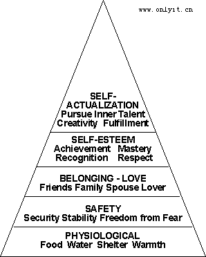 马斯洛理论把需求分成生五类基本观点 1、五种需要象阶梯一样从低到高,按层次逐级递升,但这样次序不是完全固定的,可以变化,也有种种例外情况。 2、一般来说,某一层次的需要相对满足了,就会向高一层次发展,追求更高一层次的需要就成为驱使行为的动力。相应的,获得基本满座的需要就不再是一股激励力量。 3、五种需要可以分为高级两级,其中生理上的需要、安全上的需要和感情上的需要都属于低一级的需要,这些需要通过外部条件就可以满足;而尊重的需要和自我实现的需要是高级需要,他们是通过内部因素才能满足的,而且一个人对尊重和自我实现的需要是无止境的。同一时期,一个人可能有几种需要,但每一时期总有一种需要占支配地位,对行为起决定作用。任何一种需要都不会因为更高层次需要的发展而消失。各层次的需要相互依赖和重叠,高层次的需要发展后,低层次的需要仍然存在,只是对行为影响的程度大大减小。 4、马斯洛和其他的行为科学家都认为,一个国家多数人的需要层次结构,是同这个国家的经济发展水平、科技发展水平、文化和人民受教育的程度直接相关的。再不发达国家,生理需要和安全需要占主导的人数比例较大,而高级需要占主导的人数比例较小;在发达国家,则刚好相反。 管理者可以采用下面的"激励"要素,来满足员工的不同需要: 理论的局限 |