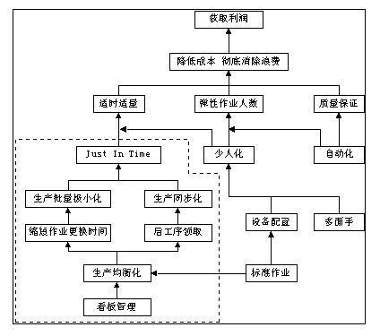 jit理论(jit theory)一、JIT的产生背景准时生产方式是起源于日本丰田汽车公司的一种生产管理方法。它的基本思想可用现在已广为流传的一句话来概括,即只在需要的时候,按需要的量生产所需的产品,这也就是Just in Time(JIT)一词所要表达的本来含义。 二、JIT的基本概念即时管理(JIT,Just in time),其实质是保持物质流和信息流在生产中的同步,实现以恰当数量的物料,在恰当的时候进入恰当的地方,生产出恰当质量的产品。这种方法可以减少库存,缩短工时,降低成本,提高生产效率。 三、JIT方式的特征JIT作为一种现代管理技术,能够为企业降低成本,改进企业的经营水平,体现在如下的两点主要特征: (一)以消除非增值环节来降低成本。 JIT生产方式是力图通过另一种方法来增加企业利润,那就是彻底消除浪费。即,排除不能给企业带来附加价值的各种因素,如生产过剩、在制品积压、废品率高、人员利用率低、生产周期长等。 (二)强调持续地强化与深化 JIT强调在现有基础上持续地强化与深化,不断地进行质量改进工作,逐步实现不良品为零、库存为零、浪费为零的目标。 JIT的实施方法及应用JIT有三种手段来达到其目标。如图。图上说明JIT生产方式的基本目标以及实施这些目标的三个手段和方法,也包括这些目标与各种手段方法之间的相互内在联系。 图:JIT的三种支持手段 一、适时适量生产 适时适量生产的方法如下: (一)生产同步化 生产同步化,即工序间不设置仓库,前一工序的加工结束后,使半产品立即转到下一工序去,装配线与机械加工几乎平行进行。在铸造、锻造、冲压等必须成批生产的工序,则通过尽量缩短作业更换时间来尽量缩小生产批量。生产的同步化通过后工序领取这样的方法来实现。 (二)生产均衡化 生产均衡化是实现适时适量生产的前提条件。所谓生产的均衡化,是指总装配线在向前工序领取零部件时应均衡地使用各种零部件,生产各种产品。为此在制定生产计划时就必须全面考虑,然后将其体现在产品生产顺序计划之中。 二、弹性配置作业人数 根据生产量的变动,弹性地增减各生产线的作业人数,以及尽量用较少的人力完成较多的生产。 三、质量保证方法 在JIT生产方式中,通过将质量管理贯穿于每一工序之中来实现提高质量与降低成本的一致性,具体方法是自动化。自动化是指融入生产组织中的这样两种机制:第一,使设备或生产线能够自动检测不良产品;第二,生产第一线的设备操作工人发现产品或设备的问题时,有权自行停止生产的管理机制。 JIT的应用一、日本丰田公司的看板管理 日本丰田公司不仅创造性地提出了准时生产的思想,而且还创造性地摸索出一套独特的富有成效的管理工具--看板。看板管理也可以说是JIT生产方式中最独特的部分。 (一)看板的种类 日本丰田公司所使用的看板的主要分类如下: 1、在制品看板:包括工序内看板,信号看板 2、领取看板:包括工序间看板,对外订货看板 3、临时看板 (二)看板的使用方法 1、后工序领取 2、适量运送 3、根据看板进行现场管理 (三)看板的功能 1、产量的调节功能 2、生产的改善功能 JIT生产方式的目标是要最终实现无储存生产系统,而看板提供了一个朝着这个方向迈进的工具。 二、JIT的未来研究方向 (一)JIT 应用与开发的研究 总结目前的研究情况,从JIT 的4 个基本成功原则,即消除浪费、员工参予决策、供应商参予、全面质量管理的角度,可以把目前有关JIT 应用与开发的研究则分为: 1、消除浪费研究 包括看板研究、单元生产研究及会计问题研究。