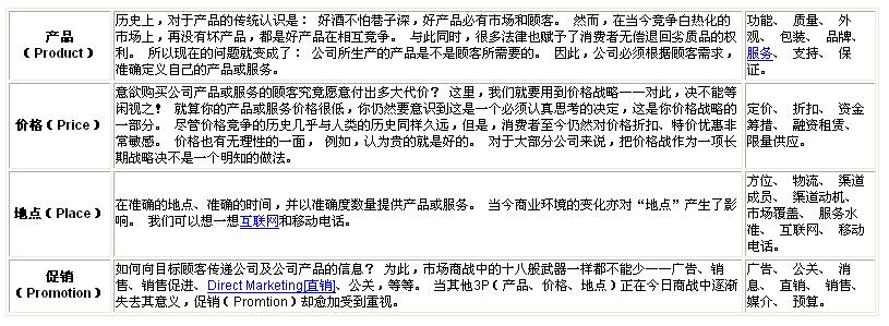 营销组合(Marketing Mix)也称作4P模型,强调了产品、价格、销售渠道和促销手段这四个在销售产品中影响巨大的因素,公司制定产品营销战略时必须对它们加以考虑。