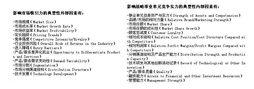 麦肯锡矩阵(McKinsey Matrix)什么是麦肯锡矩阵?麦肯锡矩阵(McKinsey Matrix)是对公司的战略事业单元进行业务组合分析的一个管理模型。 它亦被称作为: GE矩阵(GE Matrix)、业务评估矩阵(Business Asssessment Array)以及GE业务荧屏(GE Business Screen)。 什么是业务组合?业务组合(Business Portfolio)即大公司耐以依存的各战略事业单元的组合。 所谓最佳业务组合(Optimal Business Portfolio),就是指公司內的业务组合最具优势开拓最有吸引力的产业或市场。 什么是战略事业单元?所谓战略事业单元(Strategic Business Unit,简称SBU),既可以指一家完全独立的中型企业,也可以是一家大公司或集团内的一个事业部门, 只要这个部门能够独立规划自己的经营战略、有独立的经营目标,就可以被视为一个战略事业单元。 业务组合分析的目的1。对现有业务组合进行分析,对不同事业单元的增资或减资策略做出决策。 2。当公司采取成长战略时,通过业务组合分析,对新增事业单元做出决策。 3。通过业务组合分析,对事业单元的保留或裁除做出决策。 BCG Matrix[BCG矩阵]是最为著名的业务组合规划架构, 麦肯锡矩阵恰是在此基础上发展起来的更为高级的组合分析工具。 麦肯锡矩阵麦肯锡矩阵与BCG矩阵比较,在以下三个方面表现得更为成熟: 1。市场/行业吸引力(Market/Industry Attractiveness)代替了市场成长(Market Growth)被吸纳进来作为一个评价维度。 市场吸引力较之市场成长率显然包含了更多的考量因素。 比较: Five Forces[五力模式] 2。竞争实力(Competitive Strength)代替了市场份额(Market Share)作为另外一个维度,由此对每一个事业单元的竞争地位进行评估分析。 同样,竞争实力较之市场份额亦包含了更多的考量因素。 3。此外,麦肯锡矩阵有9个象限,而BCG矩阵只有4个象限, 使得麦肯锡矩阵结构更复杂、分析更准确。 通常,战略事业单元在GE矩阵图中用一个圆形图案表示(参考上图),其中: 圆的大小代表市场规模; 标有百分比的派图代表战略事业单元的市场份额; 箭头代表战略事业单元的运作方向。 麦肯锡矩阵的运用步骤分別找出市场吸引力和战略事业单元竞争能力的影响因素(根据上述典型因素)。 仔细思考这些影响因素,因为它们对企业的整体战略至关重要。 依据各因素的重要性, 决定每项因素的加权比重值。 对每个因素,分别给以评分。 加权计算各个战略事业单元在市场吸引力和竞争能力上所得分数。 得出结果图表,并对其进行阐释。 回顾/敏感度分析。 有必要的话,采用其他权重和分值重新进行计算(因为有很可能存在不同意见)。 麦肯锡矩阵的局限对各种不同因素进行评估的现实程度。 指标的最后聚合比较困难。 Core Competences[核心竞争力]未被提及。 没有考虑到战略事业单元之间的相互作用关系。
