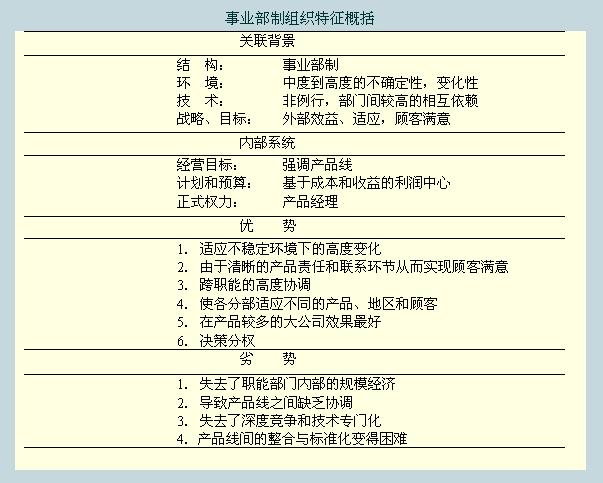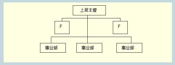 公司与事业部型组织(organization of corporation and business unit)事业部制组织结构首创于20世纪20年代的通用汽车公司,它是在总公司领导下设立多个事业部,各事业部有各自独立的产品和市场,实行独立核算。事业部内部在经营管理上则拥有自主性和独立性。这种组织结构形式最突出的特点是“集中决策,分散经营”,即总公司集中决策,事业部独立经营,这是在组织领导方式上由集权制向分权制转化的一种改革。 这种组织结构多适用于规模较大的一些公司,这些公司一般都是跨越多个产品领域,从事多样化经营的组织。组织形式如下图所示,F表示职能部门。