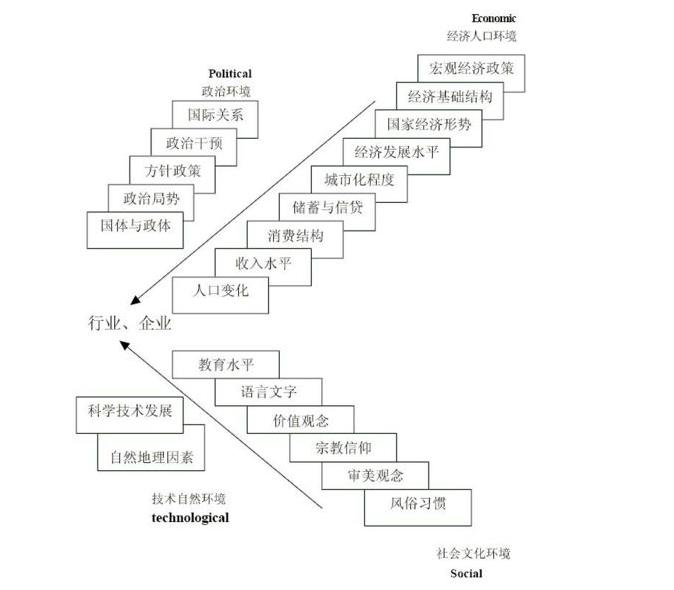 Pest 分析PEST模型简介PEST分析是指宏观环境的分析,宏观环境又称一般环境,是指影响一切行业和企业的各种宏观力量。对宏观环境因素作分析,不同行业和企业根据自身特点和经营需要,分析的具体内容会有差异,但一般都应对政治(Political)、经济(Economic)、技术(Technological)和社会(Social)这四大类影响企业的主要外部环境因素进行分析。简单而言,称之为PEST分析法。如图所示: (一) 政治法律环境政治环境包括一个国家的社会制度,执政党的性质,政府的方针、政策、法令等。不同的国家有着不同的社会性质,不同的社会制度对组织活动有着不同的限制和要求。即使社会制度不变的同一国家,在不同时期,由于执政党的不同,其政府的方针特点、政策倾向对组织活动的态度和影响也是不断变化的。 重要的政治法律变量: 执政党性质政治体制经济体制政府的管制税法的改变各种政治行动委员会专利数量专程法的修改环境保护法产业政策投资政策国防开支水平政府补贴水平反垄断法规与重要大国关系地区关系对政府进行抗议活动的数量、严重性及地点民众参与政治行为 (二) 经济环境经济环境主要包括宏观和微观两个方面的内容。宏观经济环境主要指一个国家的人口数量及其增长趋势,国民收入、国民生产总值及其变化情况以及通过这些指标能够反映的国民经济发展水平和发展速度。微观经济环境主要指企业所在地区或所服务地区的消费者的收入水平、消费偏好、储蓄情况、就业程度等因素。这些因素直接决定着企业目前及未来的市场大小。 重要监视的关键经济变量: GDP及其增长率中国向工业经济转变贷款的可得性可支配收入水平居民消费(储蓄)倾向利率 通货膨胀率 规模经济政府预算赤字 消费模式失业趋势劳动生产率水平汇率 证券市场状况外国经济状况进出口因素不同地区和消费群体间的收入差别价格波动货币与财政政策 (三) 社会文化环境社会文化环境包括一个国家或地区的居民教育程度和文化水平、宗教信仰、风俗习惯、审美观点、价值观念等。文化水平会影响居民的需求层次;宗教信仰和风俗习惯会禁止或抵制某些活动的进行;价值观念会影响居民对组织目标、组织活动以及组织存在本身的认可与否;审美观点则会影响人们对组织活动内容、活动方式以及活动成果的态度。 关键的社会文化因素: 妇女生育率特殊利益集团数量结婚数、离婚数人口出生、死亡率人口移进移出率社会保障计划人口预期寿命人均收入生活方式平均可支配收入对政府的信任度对政府的态度对工作的态度购买习惯对道德的关切储蓄倾向性别角色投资倾向种族平等状况节育措施状况平均教育状况对退休的态度对质量的态度对闲暇的态度对服务的态度对老外的态度污染控制对能源的节约社会活动项目社会责任对职业的态度对权威的态度城市、城镇和农村的人口变化宗教信仰状况 (四) 技术环境技术环境除了要考察与企业所处领域的活动直接相关的技术手段的发展变化外,还应及时了解: ⑴国家对科技开发的投资和支持重点; ⑵该领域技术发展动态和研究开发费用总额; ⑶技术转移和技术商品化速度; ⑷专利及其保护情况,等等。