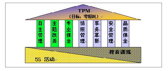 TPM的起源(Total Productive Maintenance)TPM起源于“全员质量管理(TQM)”。TQM是W·爱德华·德明博士对日本工业产生影响的直接结果。德明博士在二战后不久就到日本开展他的工作。作为一名统计学家,他最初只是负责教授日本人如何在其制造业中运用统计分析。进而如何利用其数据结果,在制造过程中控制产品质量。最初的统计过程及其产生的质量控制原理不久受到日本人职业道德的影响,形成了具有日本特色的工业生存之道,这种新型的制造概念最终形成了众所周知TQM。 当TQM要求将设备维修作为其中一项检验要素时,发现TQM本身似乎并不适合维修环境。这是由于在相当一段时间内,人们重视的是预防性维修(PM)措施,多数工厂也都采用PM,而且,通过采用PM技术制定维修计划以保持设备正常运转的技术业已成熟。然而在需要提高或改进产量时,这种技术时常导致对设备的过度保养。它的指导思想是:“如果有一滴油能好一点,那么有较多的油应该会更好”。这样一来,要提高设备运转速度必然会导致维修作业的增加。 而在通常的维修过程中,很少或根本就不考虑操作人员的作用,维修人员也只是就常用的并不完善的维修手册规定的内容进行培训,并不涉及额外的知识。 通过采用TPM,许多公司很快意识到要想仅仅通过对维修进行规划来满足制造需求是远远不够的。要在遵循TQM原则前提下解决这一问题,需要对最初的TPM技术进行改进,以便将维修纳入到整个质量过程的组成部分之中。 现在,TPM的出处已经明确。TPM最早是在40年前由一位美国制造人员提出的。但最早将TPM技术引入维修领域的是日本的一位汽车电子元件制造商——Nippondenso在20世纪60年代后期实现的。后来,日本工业维修协会干事Seiichi Naka jima对TPM作了界定并目睹了TPM在数百家日本公司中的应用。 TPM精髓要义(tpm kernel be-all)1.TPM的定义TPM是全员生产维修英文缩写,即全体人员参加的生产维修、维护体制。TPM要求从领导到工人,包括所有部门都参加,并以小组活动为基础的生产维修活动。TPM涉及到设备终生、各部位的维护保养及整个工作环境的改善,目的是提高设备的综合效率。 2.TPM的五大支柱(1)最高的设备综合效率。 (2)设备终生全系统的预防维修。 (3)所有部门都参加。 (4)从最高管理层到工人全体参加。 (5)实行动机管理,即通过小组活动推进生产维修。 3.TPM的三个“全”全员、全系统、全效率。三个“全”之间的关系是:全员是基础;全系统是载体;全效率是目标。还可以用一个顺口溜来概括:TPM大行动,空间、时间、全系统,设备管理靠全员,提高效率才成功。 4.TPM要达到的三个目的(1)提高设备的综合效率。 (2)建立一套严谨、科学的、规范化的设备管理模式。 (3)树立全新的企业形象。 5.设备的“六大损失”设备的“六大损失”为设备故障、安装与调整、闲置、空转与短暂停机、减速、加工废品、试运行减产。 6.TPM的“5S”(1)整理—取舍分开,取留舍弃。 (2)整顿—条理摆放,取用快捷。 (3)清扫—清扫垃圾,不留污物。 (4)清洁—清除污染,美化环境。 (5)素养—形成制度,养成习惯。 7.优秀TPM小组活动的标志(l)每个成员都能积极地提出合理化建议。 (2)每个成员都能自觉、自主地参加"5S"活动。 (3)每个成员都能熟练地掌握设备管理现场标准化作业程序。 (4)每个成员都能自觉地进行自我检查和评估。 (5)小组具有自主维修能力。 8.TPM的三圈闭环循环TPM活动通过对现行状态的评估,找出问题不足,制定改善措施,建立标准化体系,从而使设备状态不断改进,形成状态循环图。TPM通过设备综合效率的计算,度量管理的进步,形成度量循环图。TPM分析六大损失的程序和专题技术攻关,以求减少六大损失,达到设备最佳运行状态,形成改善措施循环图。 以上三个循环形成一个闭环,使TPM进入一个良性发展,循序渐近。 TPM的九大活动(Total Productive Maintenance Nine Activity)TPM为什么能取得如此巨大的效果?TPM为什么能在不同的行业和部门展开呢?因为针对不同的行业和部门TPM都有相应的方法。下面简单介绍一下TPM的九大活动。 当TQM要求将设备维修作为其中一项检验要素时,发现TQM本身似乎并不适合维修环境。这是由于在相当一段时间内,人们重视的是预防性维修(PM)措施,多数工厂也都采用PM,而且,通过采用PM技术制定维修计划以保持设备正常运转的技术业已成熟。然而在需要提高或改进产量时,这种技术时常导致对设备的过度保养。它的指导思想是:“如果有一滴油能好一点,那么有较多的油应该会更好”。这样一来,要提高设备运转速度必然会导致维修作业的增加。 第一,TPM基石-5S活动5S是整理、整顿、清扫、清洁、素养的简称。5S活动是一项基本活动,是现场一切活动的基础,是推行TPM阶段活动前的必须的准备工作和前提,是TPM其它各支柱活动的基石。 第二,培训支柱-“始于教育、终于教育”的教育训练教育活动放在TPM活动各支柱的首位,主要想突出教育在TPM活动中的地位,什么都知道的人不会留在企业里。对于企业来讲,推进TPM或任何新生事物都没有经验,必须通过教育和摸索获得,而且TPM没有教育和训练作为基础,TPM肯定推进不下去。可以这么认为,教育训练和5S活动是并列的基础支柱。 第三,生产支柱-制造部门的自主管理活动TPM活动的最大成功在于能发动全员参与,如果占据企业总人数约80%的制造部门员工能在现场进行彻