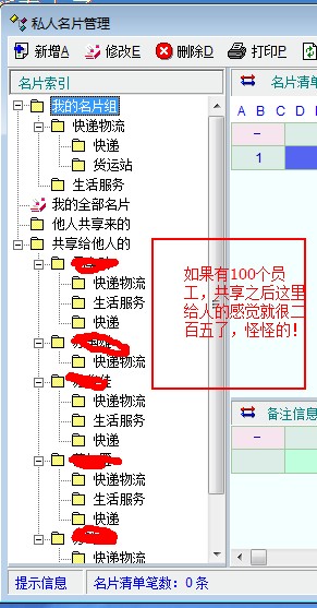 名片管理中也存在同样问题,收藏的名片只能供自己使用,要给其它业务员用只能通过共享让其它人