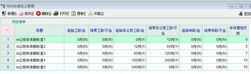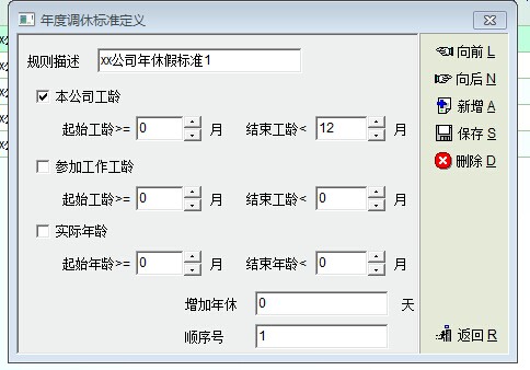 经常看到群里面一些新近人员老是在问怎么按自己公司规定设置年休假标准事宜,虽然在使用说明里面也有例子,但很多人还是一头雾水.现在我就举个实际的例子: