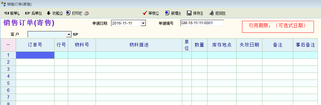 例:录入订单计划:分别不同的三个单据, 裤子1000条--交付失效期2016.11.30日,衣服600件--交付失效期2016.12.10日,衬衣700件--交付失效期,2016.12.20日。也就是说,三个品种,有不同的交付期,但不管在这些交付期内,是否都完成订单,该订单过了期限后,都无效了。但现在,无法对引用设置引用的特定时间日期,另外没引用完,也会出现在引用相关单据里,如,单据多了,这样长期已久,会对引时难以区分,需要对单据慢慢查找区分。