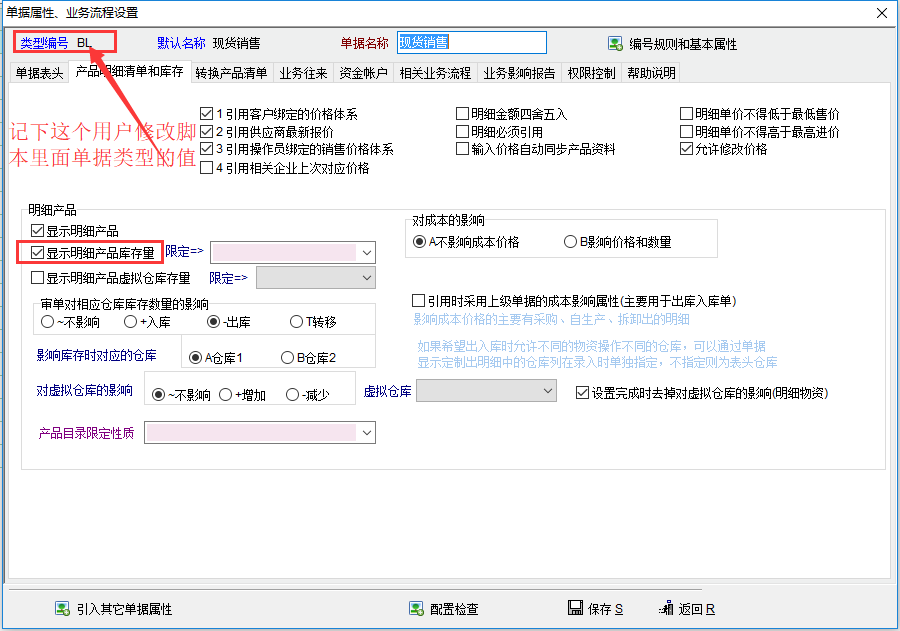 见图示的 几个步骤: 第五步:黏贴或附加下列脚本的两个部分按顺序到示例图红框处替换到原来的脚本: 第一部分: int cell_change() { num edt_num,used_num; string sql,resid,voucher_typ; voucher_typ = 'BL';//将BB改为所需定制的单据的类型,参考最后一幅图的说明。 if(change_col == 'inp_num') { resid = grid_get_v('MG_Item','res_id',change_row_id); sql = "select sum(a.inp_num) as inp_num from ebs_vr_item a left join ebs_v b on a.voucher_id = b.voucher_id where b.voucher_id <> " sql = sql + voucher_id + " AND b.voucher_type = '" + voucher_typ + "' and b.state = 'A' and a.res_id = '" + resid + "'" db_run(sql) // dbg(sql) used_num = db_res(0) // msg(used_num) edt_num = grid_get_v('MG_Item','edt_res_num',change_row_id); grid_set_v("MG_Item",'kykc', change_row_id,edt_num - used_num); } //change_col,change_col_id,change_row_id return 1; }; 第二部分: int func_before_save() { int i,rc; num u_num,inpnum,edtnum; rc = grid_find("MG_Item",'res_id',''); for(i = 1;i<rc;i++) { u_num = grid_get_v('MG_Item','kykc',i); inpnum = grid_get_v('MG_Item','inp_num',i); edtnum = grid_get_v('MG_Item','edt_res_num',i); if(inpnum>u_num || inpnum>edtnum) { msg('第 ' + i + ' 行已经超出可用库存范围,单据保存失败,请检查!')//此提示可自行修改 can_save = 0; } }; //can_save=1; return 1; }; 记住最后一步二箭头所示类型编号以便修改脚本 |