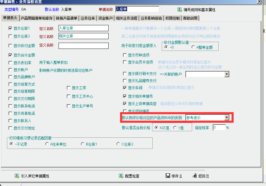 1,产品资料中定义各价格; 2,入库单的业务规则定义中“默认物资价格对应的产品资料中的类别”设定产品资料定义的价格 |