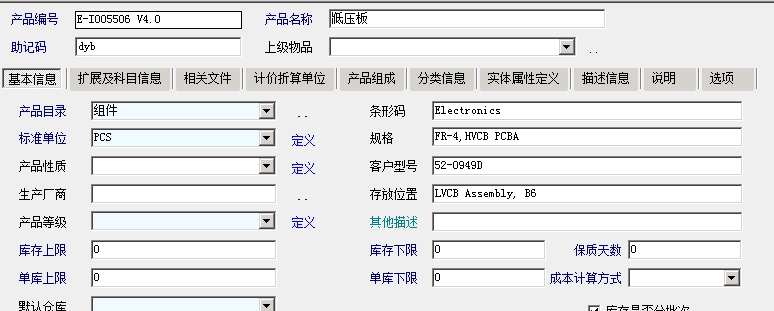 标准单位,规格,其它描述,生产厂商等一些主要参数字段。