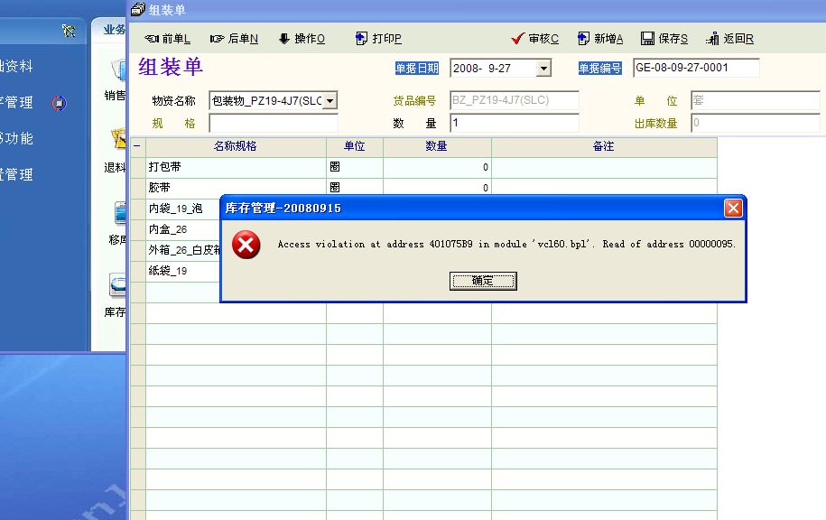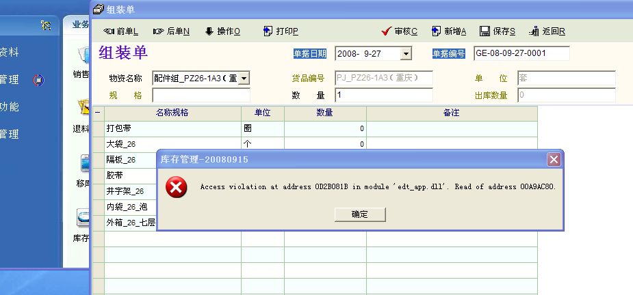 在试运行库存控制软件中发现,用组装单时,在某些位置有地址错误提示,该项物品组成不能显示。重复或重新启动,这些物品的组装单仍然提示错误。有时库存控制软件会自行退出。情况见截图0和1。