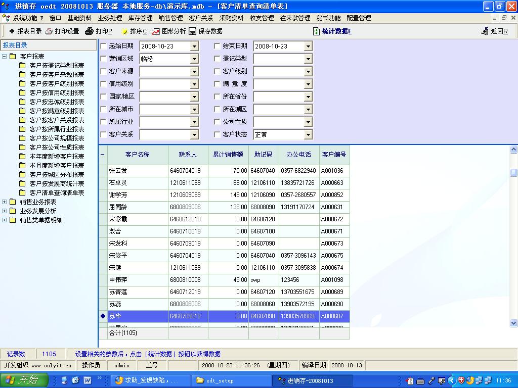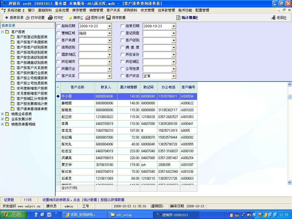在客户清单查询报表中设定了按照累计金额降序排列,发现系统并未按照严格的金额降序排列,虽然大部分基本正常,但有个别数据错乱排列,而且一些累计金额为0的也排在有数据的表中,影响使用,望三生石老兄检查。另外发现已经审核过的销售单据在这个报表中显示金额为0,但在销售明细报表中可以发现实际销售金额,删除此张单据重新输入,保存,审核后方可正常,何故?