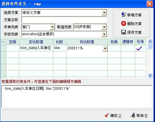 求助:"员工资料"对话框左下角的限制条件,只有有限的几个?如果,想查询其它限定条件,如查2008年11月入职的员工名单,如何查询?