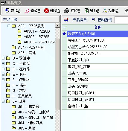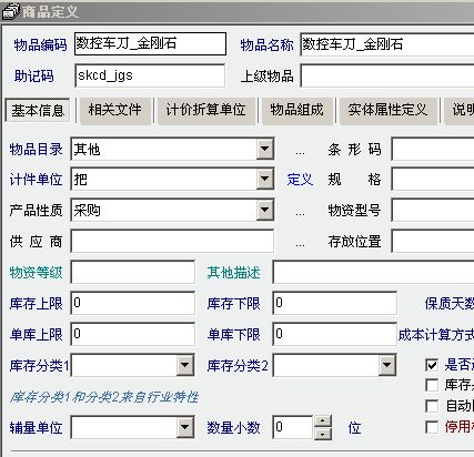如“数控车刀_金刚石”和数控外圆车刀_金刚石“产品已定义(图3),目录展开显示看不到(图4  J05),但在商品定义中查询能查到(图5)。做单据(各种入库单、出库单)时,选择物品目录都不出现。导致这两种物品做不了账。