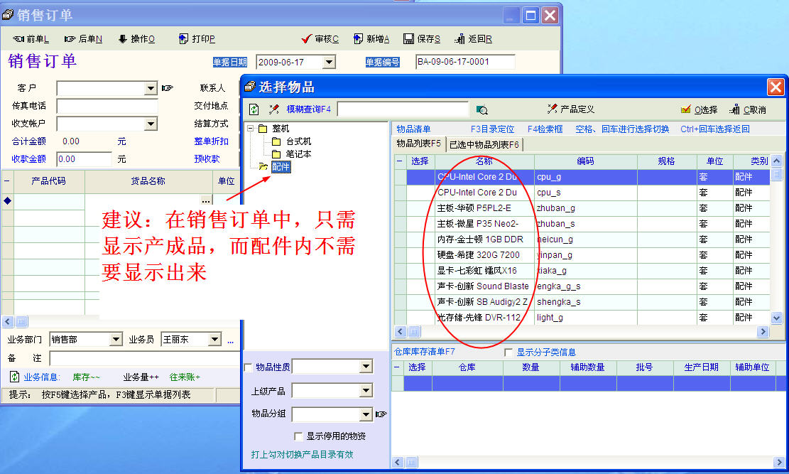 1、建议在销售订单中,选择物资时,只需显示销售产品,而其他配件、原材料等不希望显示出来,尤其在食品加工行业,更不希望显示到原材料、配料等。