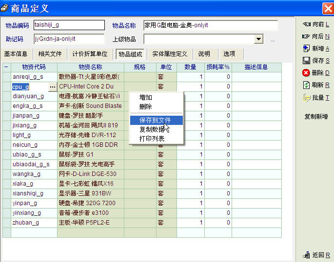 如图,在商贸管理软件的产品资料录入中物品组成的各种物品顺序暂发现不能变动,建议改进!