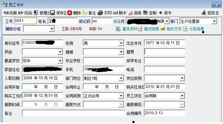 员工资料管理的功能菜单下有: 根据身份证自动生成生日、性别、籍贯,点下就执行。