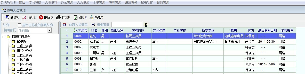如果待确定先不录,等到确定再录吗?今后还在在员工资料里录一次,在这里面不是多此一举了? 确定了的,也不用录了,员工资料里有更详细的内容。 不录用的更不用录了。 那这样看来,此项功能还有何用? |