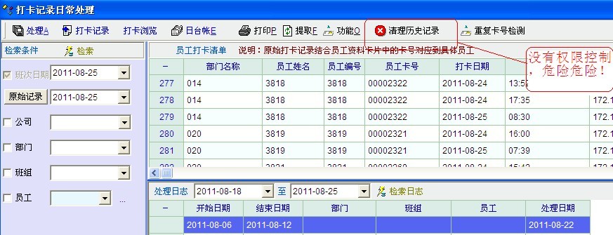 4.考勤模块中的 清除历史记录没有权限控制!这样很危险。