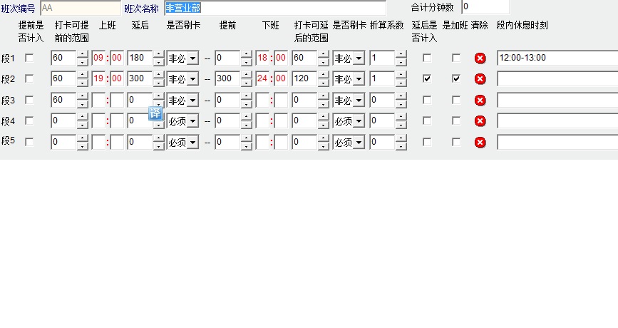 设置了考勤班次如下:现在出现的情况是,如果早上不打卡,下午在19:00前打开,算全勤,如果19:00后打卡算缺勤+加班。