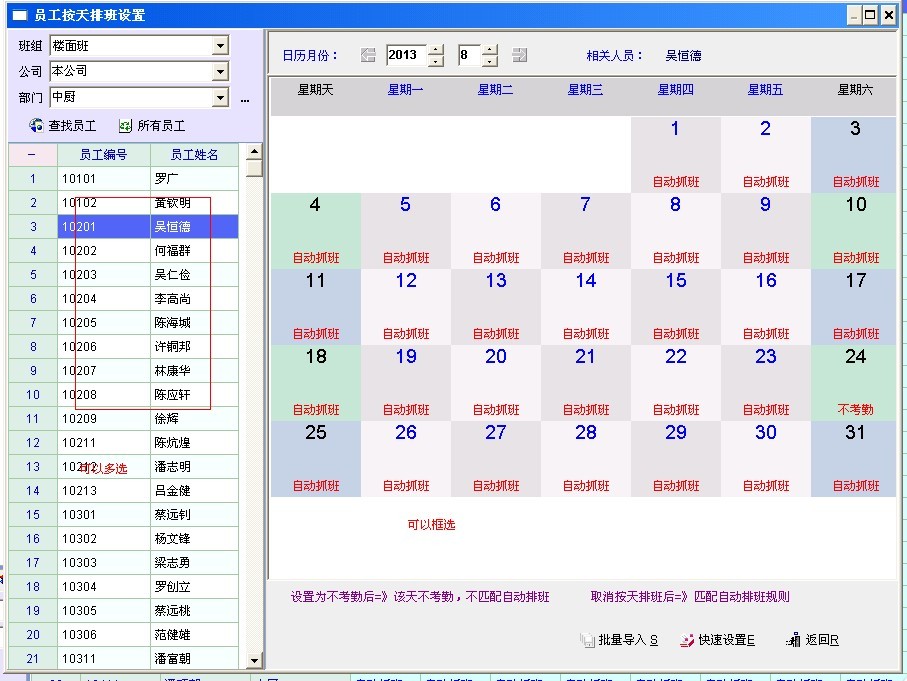 第一个可以设计成左键松开选择,第二个,多个员工批量拍多天班更实用。