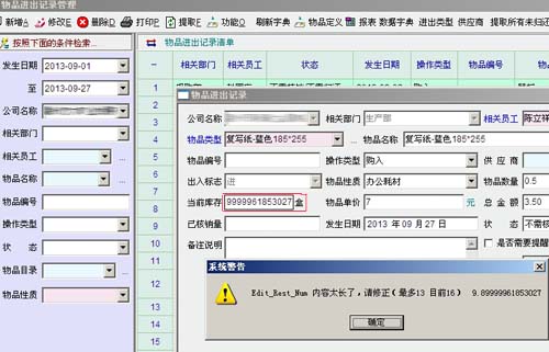 在物品进出记录里,比如说我购入1盒复印纸,100张/盒,员工领取10张,物品数量也就是0.1盒,然后保存,当再新增领取复印纸时就会在当前库存显示很多位小数点,怎么解决这个问题?如下图: