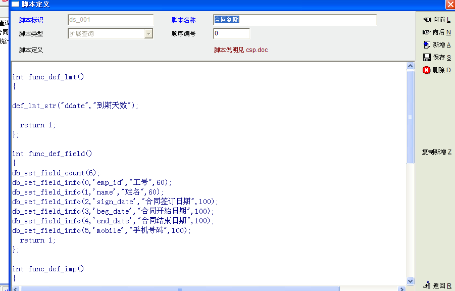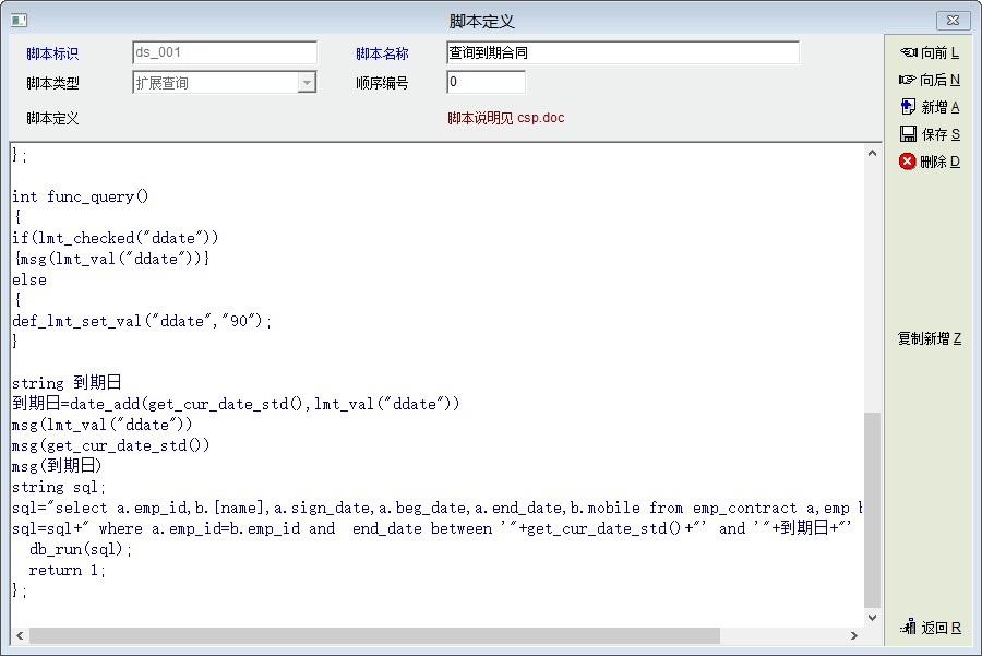 1、打开配置管理,点数据脚本。点左手边,扩展查询,右键增加一个,脚本名称随便填,如提取到期合同。 2、在下面的脚本定义框中输入如下脚本 int func_def_lmt() { def_lmt_str("ddate","到期天数"); return 1; }; int func_def_field() { db_set_field_count(6); db_set_field_info(0,'emp_id',"工号",60); db_set_field_info(1,'name',"姓名",60); db_set_field_info(2,'sign_date',"合同签订日期",100); db_set_field_info(3,'beg_date',"合同开始日期",100); db_set_field_info(4,'end_date',"合同结束日期",100); db_set_field_info(5,'mobile',"手机号码",100); return 1; }; int func_def_imp() { return 1; }; int func_init() { return 1; }; int func_query() { if(lmt_checked("ddate")) { //msg(lmt_val("ddate")) } else { def_lmt_set_val("ddate","90"); } string 到期日 到期日=date_add(get_cur_date_std(),lmt_val("ddate")) string sql; sql="select a.emp_id,b.[name],a.sign_date,a.beg_date,a.end_date,b.mobile from emp_contract a,emp b" sql=sql+" where a.emp_id=b.emp_id and end_date between '"+get_cur_date_std()+"' and '"+到期日+"' and b.state!='F'" db_run(sql); return 1; }; 保存即可 退出后就可以看到扩展查询下面多了个提取到期合同的项,单击,再点查询 |
