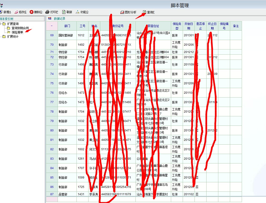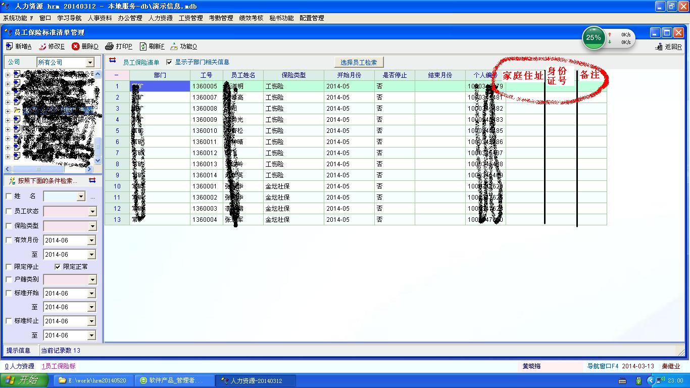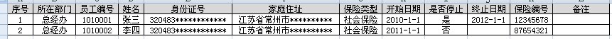 个人觉得还是在“员工保险标准清单管理”页面中增加显示“身份证号、家庭住址”这些字段显示比较方便实用! |