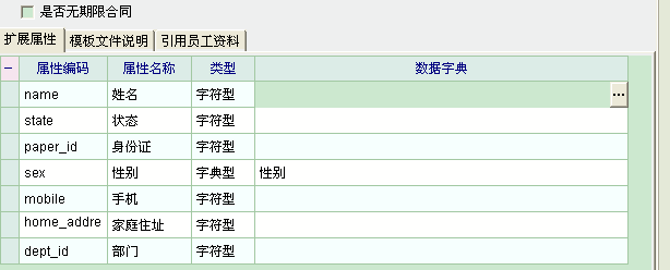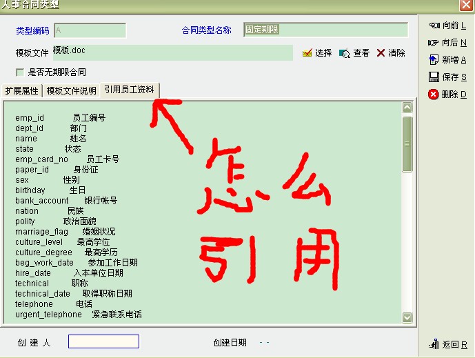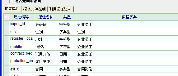 “引用员工资料”选项里是emp员工资料表的字段意义,给你参考用的,要引用哪个字段,在“引用员工资料”选项里看,如要添加手机,可以看到“mobile 手机”,那么字段名mobile的值就是手机。 返回到扩展属性里,添加右键新建个字段,编码填mobile,属性名称随便填自己知道意思就好,如手机,类型字符型,有些字典型如部门,岗位之类的类型就用字典型,字典选好。 在模板文件里对应要引用的地方写$+属性编码就行