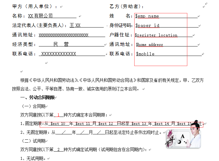 员工个人资料里面有很多信息,合同中可以用到的例如:身份证号、电话、住址等等 系统默认的变量在word中引用基本无误,自己扩展的也没问题 就是不知道如何在“属性里可以引用员工资料里面的信息“
