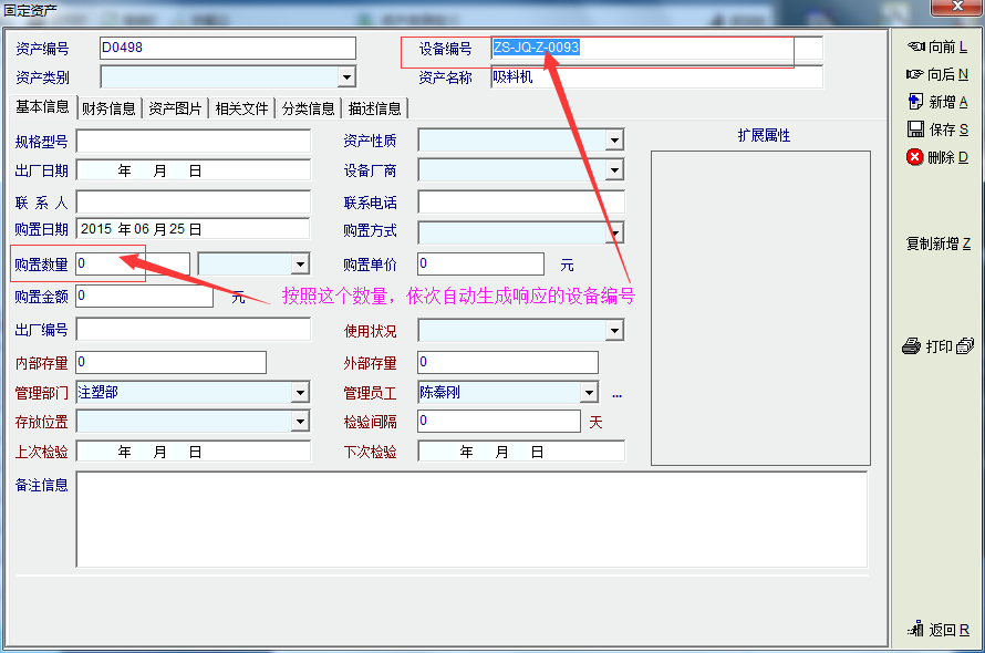 既然是固定资产,那么难免有时候就会采购同样的设备多套,或者是相同种类的设备多套,现在的方式是在采购数量中填入多套,生成也还只是一个设备编号,这样就需要手动重复的输入相同数据多次,比较麻烦。 如果在可能的情况下,能不能修改为这样:按照采购的数量,下面依次自动生成相应的编号,这样只需填入采购的数量,依次就可生成多个设备编号,避免了重复输入,也省了很多的时间。