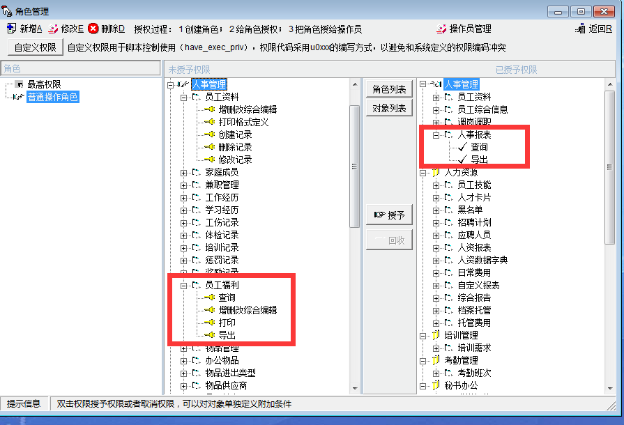 很多没有给查询权限的项目(如奖惩、培训社会关系等等)都可以在绑定操作员后通过统计报表下的各种报表实现查询功能,希望这个地方可以给修改一下:没有查询权限,就看不到报表