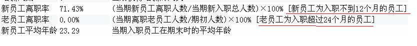 新员工离职率 71.43% (当期新员工离职人数/当期新入职总人数)×100% [新员工为入职不到12个月的员工] 老员工离职率 0.00% (当期离职老员工人数/期初人数)×100% [老员工为入职超过24个月的员工] 新员工为入职不到12个月的员工,这一句定义,怎样修改为 新员工为入职不到1个星期的员工? 老员工为入职超过24个月的员工,这一句定义,怎样修改为 老员工为入职1个月的员工? 因为岗位特殊,考察期短,所以想修改计算方式