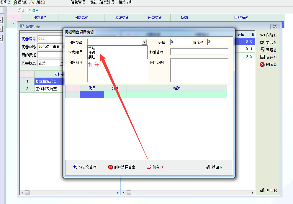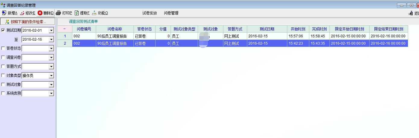 最近测试了软件的”调查、考卷“功能,可以通过外网或者手机填写答卷,这确实要比原来的工作方式要高效,但是也发现了一个问题:答卷管理目前只是针对”考卷“,像”调查“类的问卷不能进行选项的分类汇总和数据分析,例如第一题选A的有多少人,占总人数的多少,分别是哪些人。 还建议”问题类型“中增加”打分“类型,这主要用在公司内部的民主评议中,由员工对被测评人进行打分,”打分“类型的分数可以自动计算。 调查问卷功能真的很有意义,如果把这个模块再优化一下,感觉咱们的软件又可以考虑涨价了!