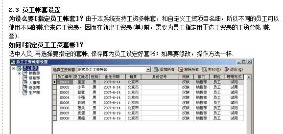 为设么要[指定员工帐套]?由于本系统支持工资多帐套,和自定义工资项目名细,所以不同的员工可以使用不同的帐套来造工资表,因而在新建工资表(单)前,需要为员工指定用于造工资表的工资套帐(帐套).
