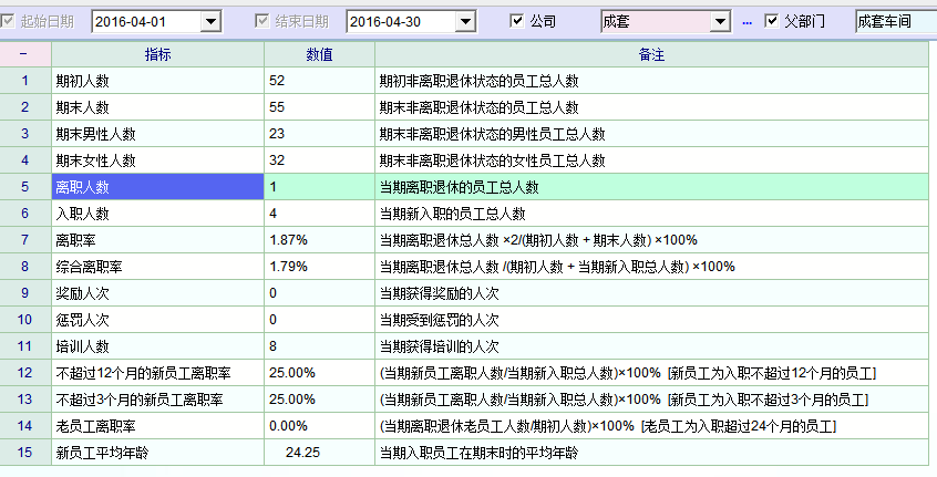 在人事综合报表中只有入离职人数,但实际上会有部门人事变动的不只是入离职,还有员工调动,如果这个员工很早在公司任职,只是这个期间调动部门了,那在这个报表中是无法体现的。 统计时会算在期初人数里,但是这个是不准确的,期初这个人员还不在这个部门啊。 所以建议: 1.增加调入和调出人数【将岗位异动里面的数据统计过来】 2.期初人数不要包含当期调入人数