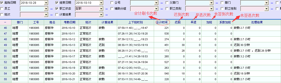 考勤报表统计的问题,能否改成统计签到和签退次数,未签到未签退的次数,谢谢!! 比如一天上午须签到上班签退下班,下午也要签到上班签退下班,一天就需刷卡4次,一周5天上班就需刷卡20次 需要统计的信息就7个 1、总的签到签退次数 2、签退次数 3、签到次数 4、未签到次数 5、未签退次数 6、迟到次数 7、早退次数 希望大侠们能帮忙,谢谢啦!!!!
