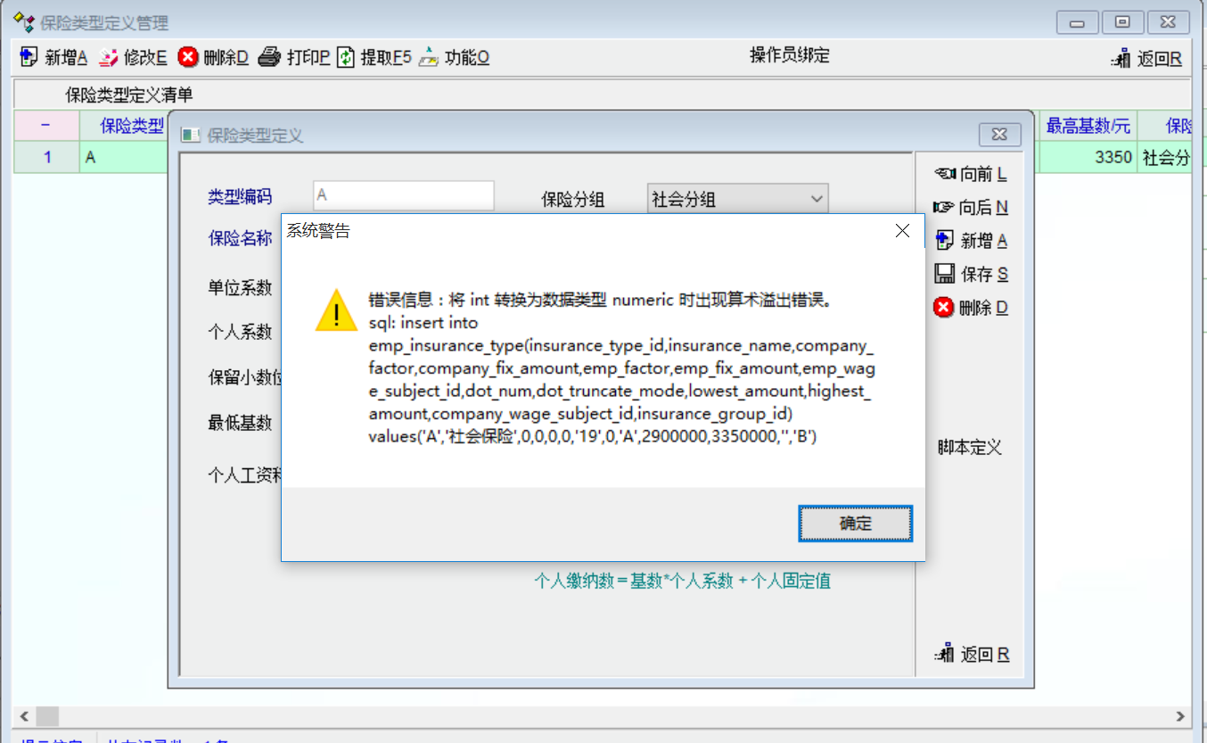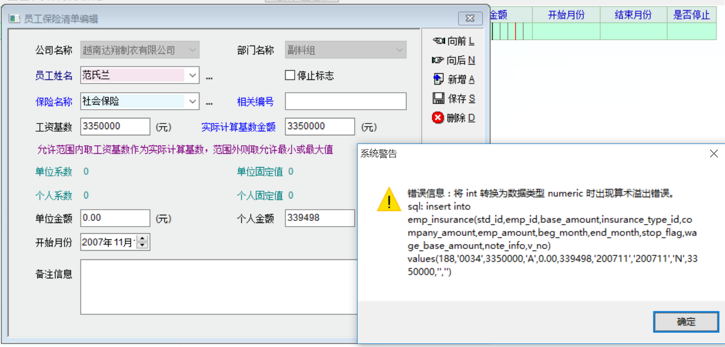 老师,在保险类型和保险标准里面的金额输入能否扩展到可以输入百万金额的数字,因为软件在越南使用,员工的基本工资=3,350,000VND,目前在实际操作中,输入百万金额,系统会出现如下错误提示,所以希望老师能改善这个问题。谢谢!