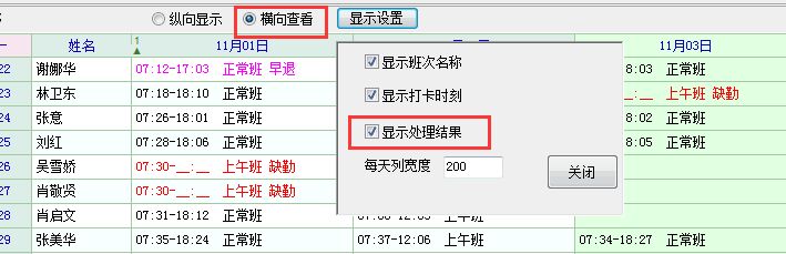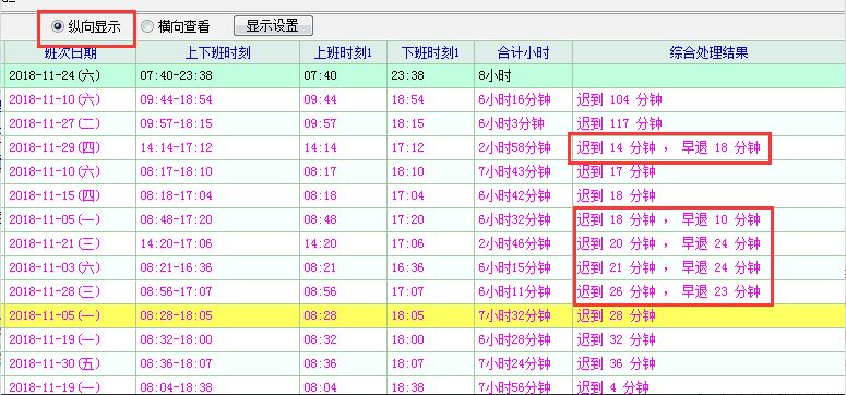 各位老师,有没有发现:日台帐明细,横向查看处理结果,当同时存在'迟到'和'早退'情况时,仅显示'早退的情况',纵向结果在综合处理结果字段就是正常情况,难道横向的取值方式不一样,有没有哪位老师能改进改进下啊,辛苦了老师们。