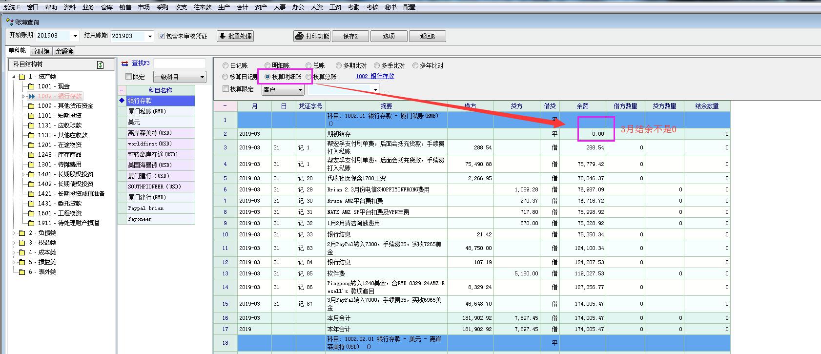 求助_账簿查询银行存款一级科目 选择核算明细账时,各科目期初金额没结转过来_人力资产