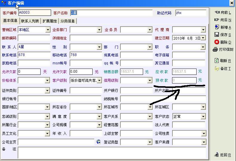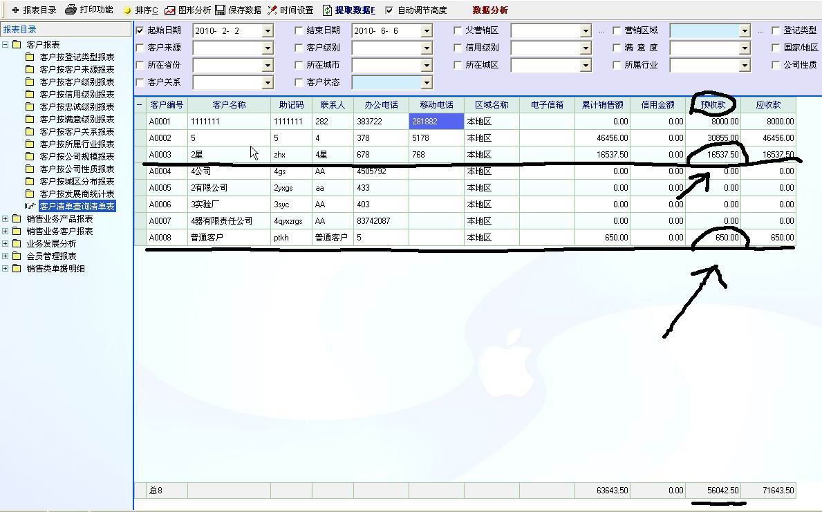 销售管理-->销售报表-->客户清单查询清单表  预收款不正确 , 有几个客户没有做任何收款操作,预收款为0,但客户清单查询清单表里有预收款,数额等同累计销售额,总预收款数额也不正确。双击不正确的客户,弹出的客户编辑窗体里得预收款为0。  点击其他客户报表的预收款数据都是正确得。
