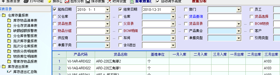 功能如库存进出总帐,但能否进行月度对比,能够将几个月的进出放在一个报表中,方便对比统计。比如季度统计,就会分别出现在3个月的进出数据,比如年度对比,就会出现12个月的进出情况