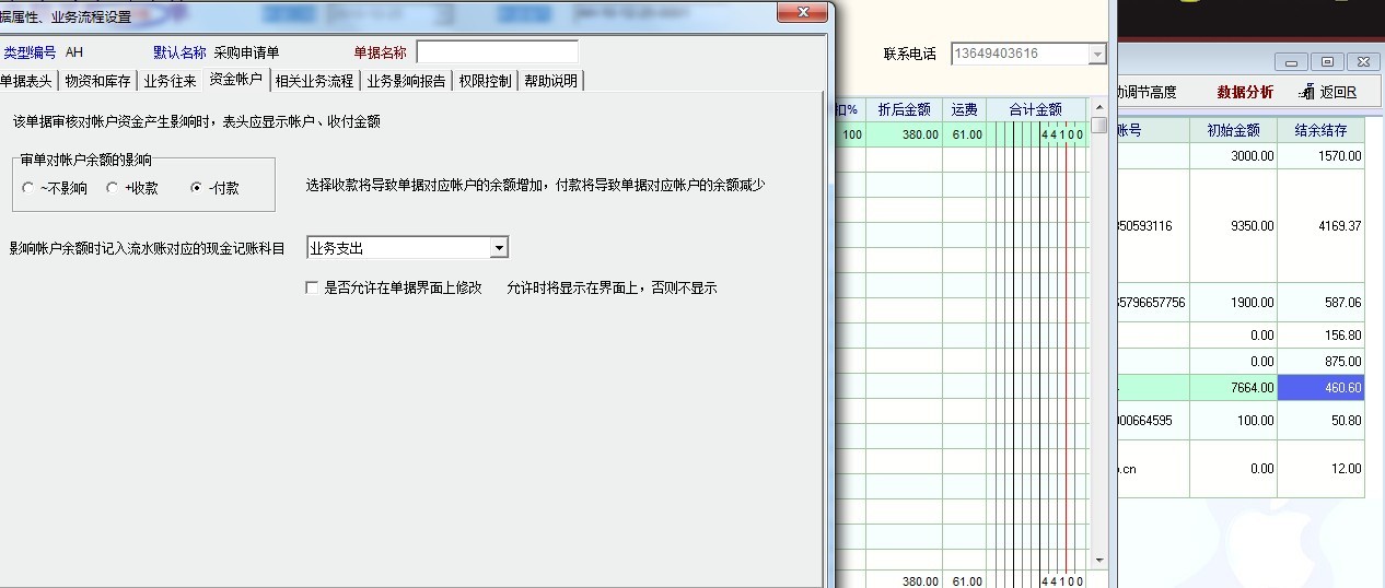 采购申请单,我设置了“审单对账户余额的影响” ,但是审核单据之后账户余额还是这么多,并没有任何动静。重启管理系统也是一样和原来这么多钱。是不是还需要设置哪里?
