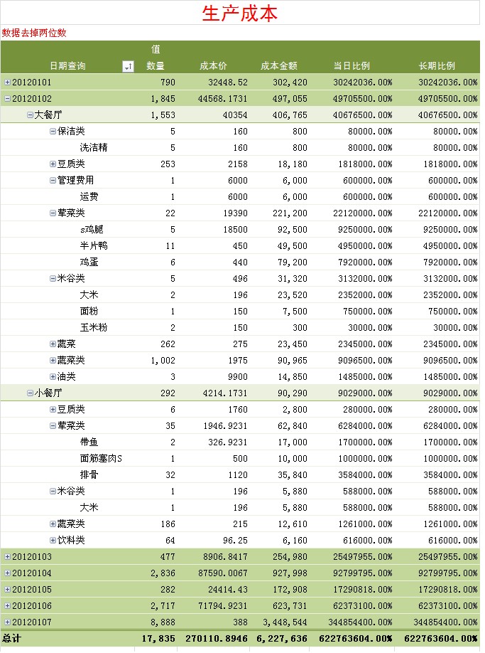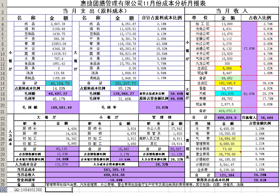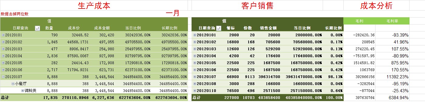 我现在在餐饮企业工作,成本分析模块的作用主要在于分析当天生产原料(比如大米金额)占当天总生产原料的比例,占当天营业额(收入)的比例,可以分类统计,形成报表。我现在急需这样的一个模块。