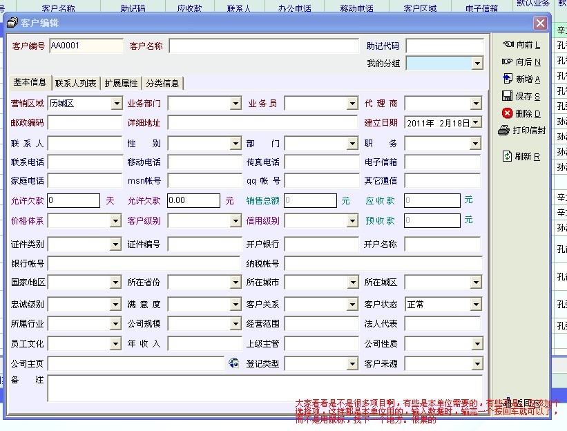客户管理中新增客户编辑时,能否自己定制一下啊,只出现本单位需要的项目。单个输入时,不大明显,而输入大量合同时,新增客户量大,就有些头大了,得满里面找地方填数据,影响输入速度,显得也累,这样也显得更人性化了。