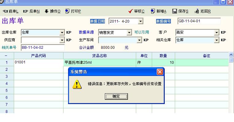 请问审核出库单的时候显示:更新库存失败,仓库编号没有设置
