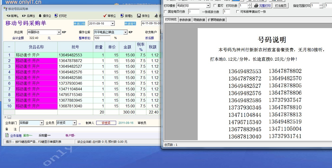 本人用于打印销售移动公司套卡,用批次表示号码